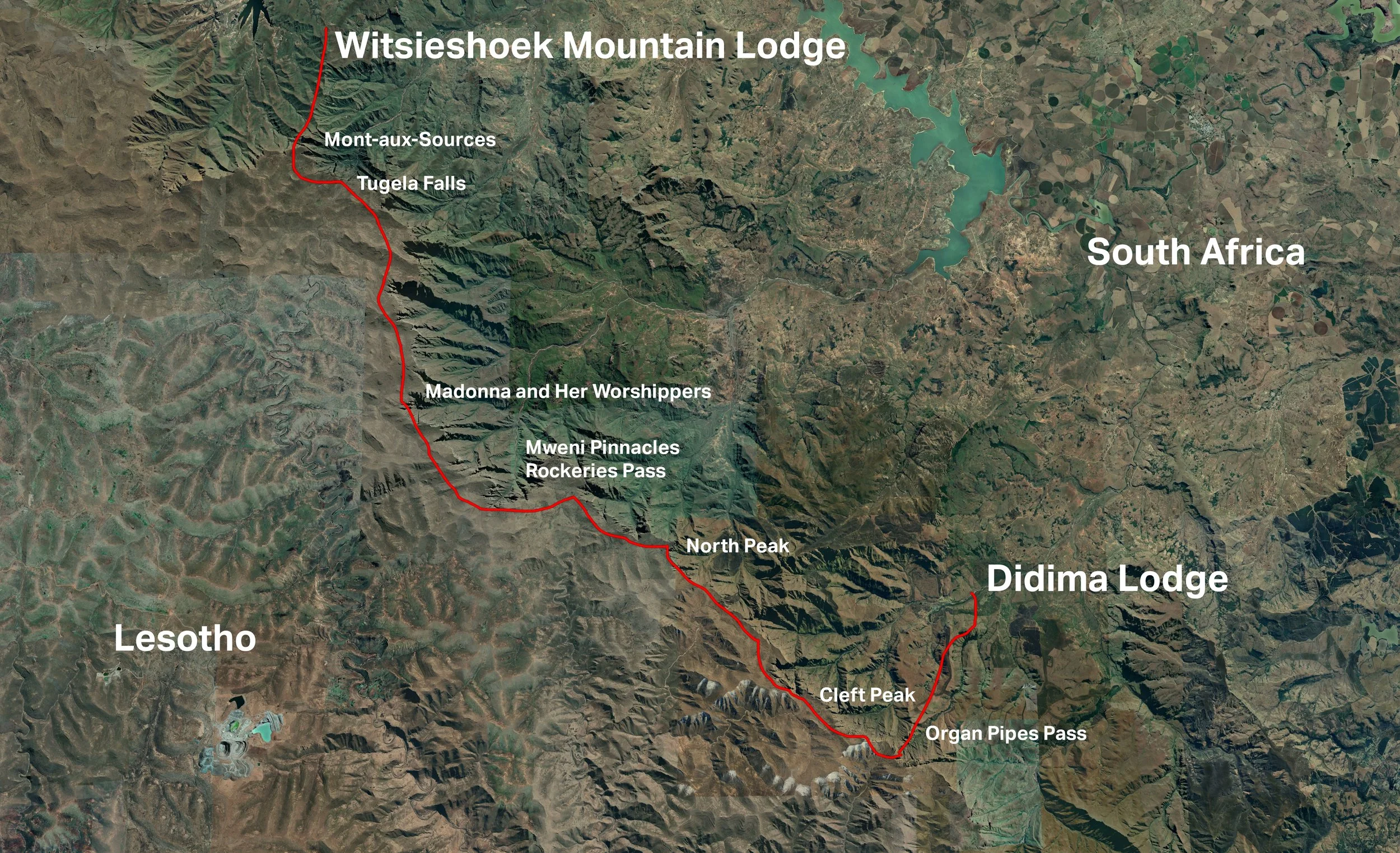 We will be walking the famous ~75km northern traverse, a shorter version of the Grand Traverse which walks across the entire Drakensberg range. The northern traverse explores the most dramatic scenery in the Northern Drakensberg, including Mont-aux-Sources, Cathedral Peak, Tugela Falls (second highest waterfall in the world), Mweni Pinnacles, North Peak, South Peak, Cleft Peak, and Rockeries Pass. Below is the standard 6 day itinerary, but we will add extra small hikes at sunrise/sunset to access particular features for photography. The extra day to complete the traverse (usually done in 5 days) also has the side benefit of shortening a few of the day’s hikes!