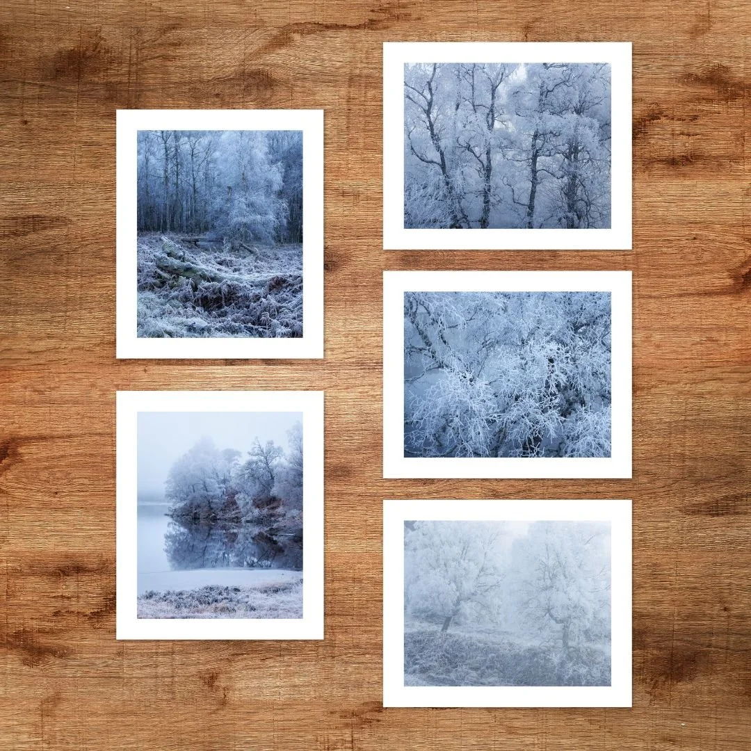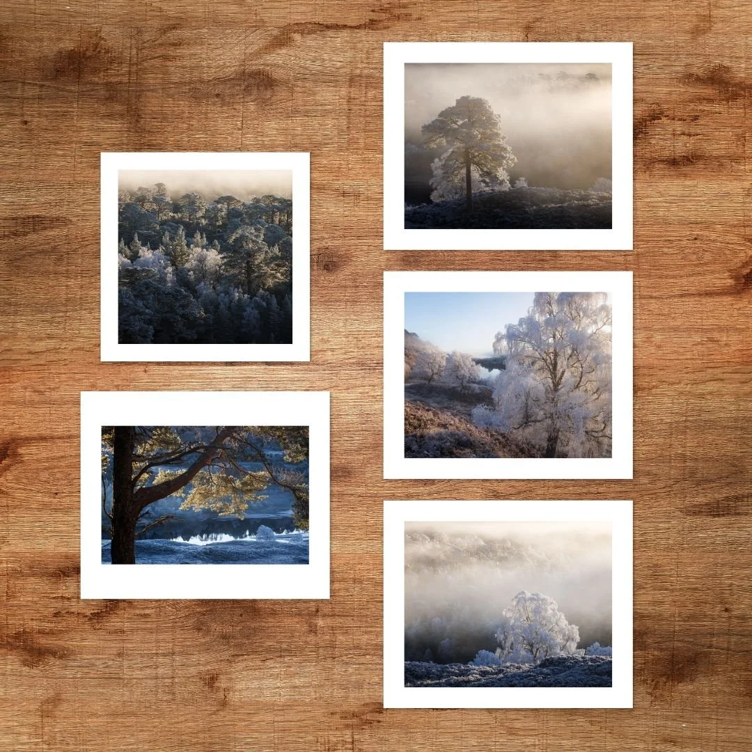 This fine art photography print portfolio includes explores the theme of winter trees; all 5 images were made on a bitterly cold morning in Scotland’s Ancient Caledonian Forest. Included photographs:
